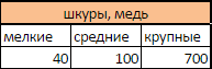 шкура самца (крупная) (1400 медных) шкура самки (средняя) (200 медных) рога самца (0 медных)
