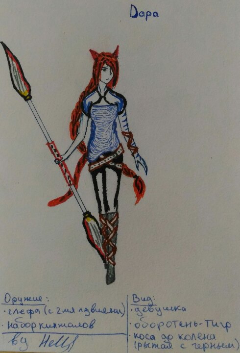| 1.Даравель Ольбурд, Дара. 2.Оборотень (тигр). Травница, довольно поверхностно знакома с лекарским делом. 3.Женщина, 19 лет, би. 4.В возрасте полутора лет маленькая Дара прибыла с матерью на материк из-за океана. Её мать – тёмный маг-артефактор, рассказывала девочке, что покинуть прежний дом им пришлось из-за врагов отца. Спасая семью, он посадил их на корабль, собираясь отвести погоню и отправиться следом, но пропал без вести. Однако сама Дара по многим причинам полагает, что он просто их бросил. На Ракризе они поселились в одной из деревушек оборотней у подножья гор. В работе над очередным артефактом мать девочки могла по несколько дней не замечать ничего вокруг. Сама же Дара с малых лет проводила это время в лесу, где обнаружила способность общаться с животными. Как большинство врождённых оборотней, она быстро научилась управлять своими способностями, в том числе и оборотом. В этом ей помогали некоторые жители деревни, которые также научили её довольно сносно драться в рукопашной. Тем не менее, особый интерес Дара всегда проявляла ко всему, связанному с растениями – от лечебного отвара до ядовитых грибов. Однажды во время поездки на ярмарку в округ Хандел её мать познакомилась со светлым эльфом. Несмотря на некоторые противоречивые факторы (например дочь-оборотня и не совсем светлую магию самой женщины) они искренне полюбили друг друга и поженились. Несмотря на скептическое отношение к данной ситуации и возможному «счастливому» будущему, отчим Даре понравился. Но когда он решил забрать жену в лес Фиерджена, девушка решила, что самое время двинуться собственной дорогой. С тех пор странствует уже больше двух лет, занимаясь наёмничеством, по-тихому истребляя нежить, улучшая когда придётся навыки травничества и пытаясь определиться с целью в жизни. 5.Обладает спокойным, но раздражительным характером. Чаще всего она не показывает эту черту, но под настроение раздражителем может стать что угодно от неподходящей позы собеседника и недостаточно холодного напитка. Из-за этого бывает ввязывается в конфликты. Несмотря на это, быстро остывает и намеренно вывести её из себя очень сложно. Спокойно относится к представителям любых рас, но недолюбливает высокомерных индивидуумов и фанатичных инквизиторов. Придерживается принципов «доверяй, но проверяй», «на идиотов не обижаются» и «относись к собеседнику так же, как он к тебе». Терпеть не может нарушения личного пространства чужими людьми. И уж ни в коем случае не дёрганья за хвост и уши! 6.Полное и частичное обращение в тигра, понимает животных и имеет крайне острое обоняние. Устойчива к гипнозу, внушениям, иллюзиям. Имеет слабую чувствительность к большинству натуральных ядов. Изобретательна, в драке использует любые средства от собственной внешности до тактильных ядов. Хорошо метает любые подходящие для этого предметы (в том числе и людей). 7.Плохо спит в присутствии малознакомых личностей. Часто обманывается первым впечатлением, произведённым собеседником. Не любит ждать в засадах. Плохо владеет мечом и совсем не умеет стрелять. Слабые способности в магии. 8. 9.Двойная глефа. Пояс с метательными кинжалами. Два средних кинжала для ближнего боя. Набор трав, зелий и ядов.
