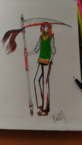 - коса (магическая - передает магию, для удобства сворачивается в посох) - Малый набор зелий аля "призови и далеко не уходи" и "Призови как можно быстрее", большой набор зелий "Изгони, что призвал немедленно!" - Кошелек - Наряд (как же без этого) - Конь складной в виде скелета - плащ с капюшоном