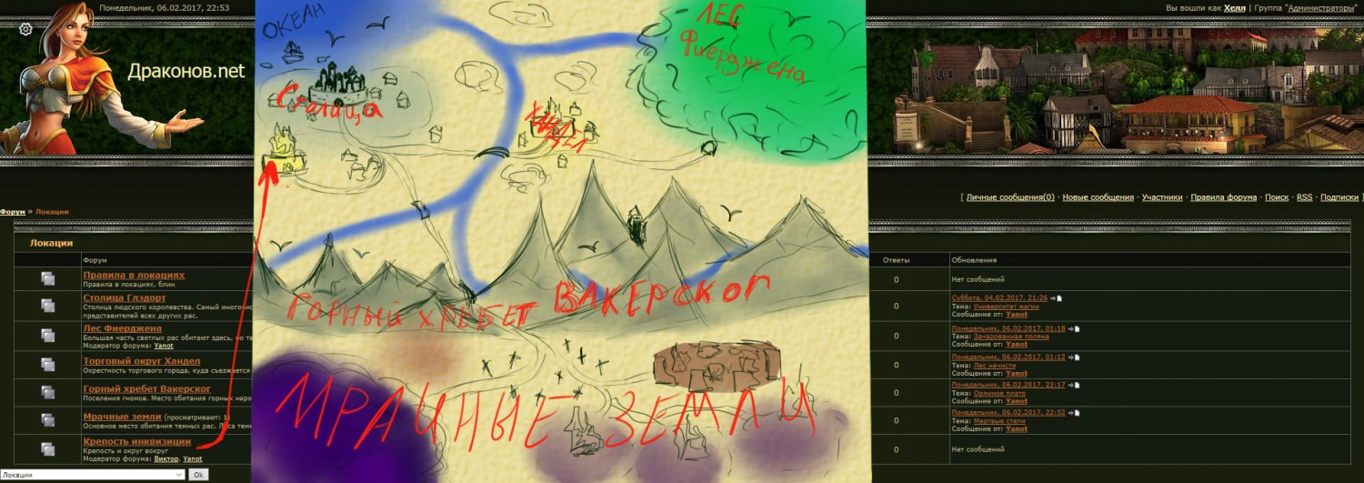 Где-то в Междумирье, где вьется Тропа между мирами, соединяющая их, находился один из древнейших миров, наполненный древними существами - драконами. Мир терпел упадок, и в нем было принято считать виноватыми пятеро драконов - Черный дракон стихии Тьмы Ар, Красный дракон стихии Огонь Ирон, Белый дракон стихии Воздух Лерун, Зеленый дракон стихии Земля Ера и Синий дракон стихии Вода Зир. Они были приговорены к вечному изгнанию и оказались в Междумирье, на Тропе, без дома, еды и воды. Побродив пару недель, они собрались на совет и решили создать свой мир, где в качестве Богов выступать будут они. Создание мира доверили Ару. Мир, созданный драконом Тьмы, изначально был Темным. Это был рассвет темных эльфов, как высшей расы, за ними шли маги, получившие благословление Черного дракона и получившие возможность поднимать из могилы мертвых, за ними уже все остальные - по степени уменьшения темной магии. Мир развивался. С каждым днем увеличивалось количество магии в нем, но, как это бывает в таких мирах, пришел упадок технологий. Однако, свободолюбивый Ар не смог долго усидеть на одном месте, наблюдая за постепенным развитием. После долгих раздумий, он обратился к товарищам и покинул мир с целью прогулки. Но, так и не вернулся - в другом мире он нашел свою судьбу, и совершенно забыл о своем мире. Так закончилась темная эпоха - эпоха Черного дракона. Дела управления миром легли на плечи четырех драконов. Первым сдался Красный. Ничего не сказав, он спустился в мир, принял облик человека и поселился в горах. Управлением мира занимался Белый дракон. В его правление появились Светлые расы - отделились и осветлились Светлые эльфы, начали появляться светлые маги-стихийники. В трудах Белого огромную помощь оказывал Зеленый - до этого скрытый за спинами других драконов, он сумел породить множество всевозможных существ - от василисков до киринов, и таким же чудом исчезнуть. Долго ходили слухи, что его убил медленно сходящий с ума Красный, или что наоборот он присоединился к нему и остался жив - достоверно это не известно, так и остается слухами. Слухи постепенно забывались, и, вскоре, о Зеленом вообще забыли. Переломный момент наступил, когда Красный окончательно потерял рассудок. Решив, что Черный специально их бросил, он решил уничтожить все то, что он создал. А именно - весь мир. После долгих рассуждений, он решил отравить океан, создав и влив в него мощнейший яд. Водный дракон не смог терпеть гибель водных существ и, спустившись в мир, слился вместе с океаном, пропустив через себя весь яд. От него мало что осталось, но океан оказался чист, а к водным существам добавились изящные морские змеи. Вторую попытку отравы Красный попробовал совершить с воздухом. Последний, Белый, не выдержал и, взмыв в небо, распался, оставив в воздухе только свой дух и породив Святую магию. Оказавшись заблокирован и в воздухе, Красный совершил третью попытку. Представившись Черным Властелином он собрал громадную Армию и пошел войной на все расы. Однако и тут ему помешали - пятеро героев, по количеству драконов и с похожей на них силой, выступили против него. И одержали победу. В живых остались двое - девушка-маг, дух которой позже принял к себе Белый, и Главный Герой, основавший Инквизицию и возведя Белого и Святую в ранги Богов. Так, в мире, не осталось ни одного живого дракона. Однако, никто н